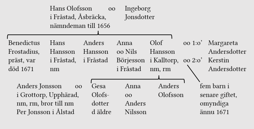 Vid tinget den 8 september 1656 (§ 19) ersatte Olof Hansson den ålderstigne Hans i Fråstad, Åsbräcka, som nämndeman. Företrädarens fulla namn var enligt de först bevarade mantalslängderna Hans Olofsson och eftersom han vid denna tid var den ende Hans i Fråstad måste han varit Olofs egen pappa. Att Olof kom från Fråstad framgår av att han hade två bröder och en syster där; de hette Anders, Hans och Anna (Flundre hr., 13 jan. 1665, § 5; ibid., 10—11 juli 1674, § 27; ibid., 7—8 juni 1675, § 28). Dessutom fanns en tredje bror, som studerade i Uppsala och prästvigdes 1668 för Göteborgs stift, i syfte att verka som huspräst. Han hette Benedictus Johannis Frostadius (ibid., 6 nov. 1671, § 7, jämte C.W. Skarstedts herdaminne och Akademiska konsistoriets protokoll i Uppsala). Huruvida denne herr Bengt hann få någon annan tjänst än som informator (privatlärare åt barn i bemedlade familjer) innan sin för tidiga död är oklart. Grevinnan Christina Brahe önskade anställa honom men biskop Klingius krävde först domkapitlets beviljande. Om än bara bonde fick även Olof Hansson besöka städer uppåt landet, eftersom han bevistade 1668 års riksmöte i Stockholm. Då beslutade ständerna att man skulle inrätta Riksens Ständers Bank, föregångaren till Sveriges Riksbank.