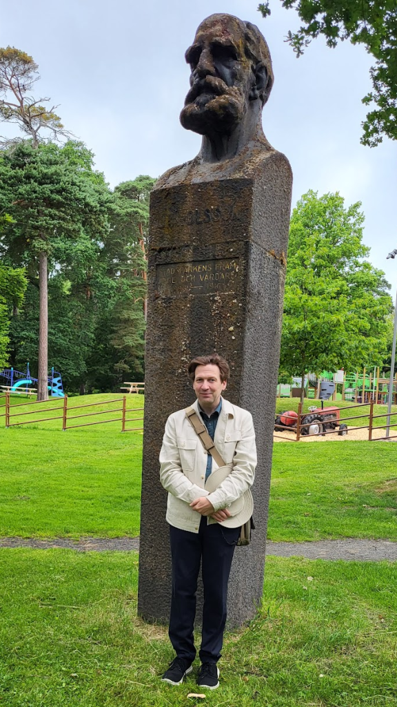 2. Utflykter. Ett fynd i sidled, från Ale härad räknat, föranledde en avstickare till Jönköpings stadspark under sommaren. Det var när jag arbetade med farfarsmors farsfarfars personakt (se här), som jag upptäckte att sonen och timmermannen i Göteborg, Anders Olsson, vid sin död 1902 efterlämnade en son i sin tur och att denne benämndes ”Postmästaren och Riddaren Herr Johan Albert Olsson i Jönköping”. Inte illa med en riddare (av Vasaorden) bland farfars morfars kusiner, men än mer roande att hitta en postmästare eftersom jag själv varit brevbärare. Ytterligare efterforskningar (d.v.s. sökningar via Google) gav vid handen att herr Olsson under det sena 1800-talet var en pådrivande kraft i att ge Jönköpingsborna ett rekreativt grönområde på höjden ovanför staden. Under min och mammas sedvanliga sommarresa till Ostkusten, där vi skulle hälsa på farbror Yngve i Västervik för att sedan fortsätta hem över Östergötland, blev det tillfälle att åka upp till stadsparken, som inte kännetecknas av typiska prydnadsplanteringar utan består av en mer otämjd växtlighet. Tyvärr tillät inte tidschemat någon längre vandring på naturstigarna, bland alla ståtliga träd och friluftsmuseets Skansenliknande byggnader. Regntunga skyar skyndade också på besöket men som tur befann sig en högrest gråstensbyst av J.A. Olsson, ”Stadsparkens främjare och vårdare”, precis vid parkeringen, så vid den kunde jag posera för ett kort. Som ni kanske ser var den gamle mannen rätt mossbelupen men jag har förstått att han fick en välbehövlig tvätt och ansiktslyftning kort efter vårt besök.