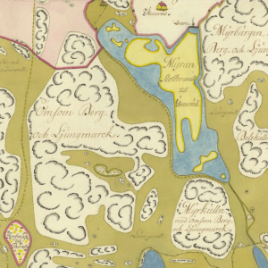 Utmark. Bilden kommer från en avmätning över utmark i Harestads, Torsby och Ytterby socknar 1774 – ett slags inverterad kartbild jämfört med de samtida storskifteskartorna, som i regel bara visar inägornas utsträckning. Här finns flera bortglömda naturnamn med, till exempel Belekullen till höger. Längst ner i vänstra hörnet syns på utsnittet Toreby mosse, idag en liten damm. Följer man vägen därifrån rakt uppåt (i verkligheten mot nordväst) kommer man till ett rosa fält där ”Kampetorps hed” och Torsby socken tar vid. Stenliden fanns inte när kartan ritades men dess tomt kom att ligga i den gröna triangeln till höger om vägen, alldeles intill den röda gränslinjen. Se hela kartan på länken: