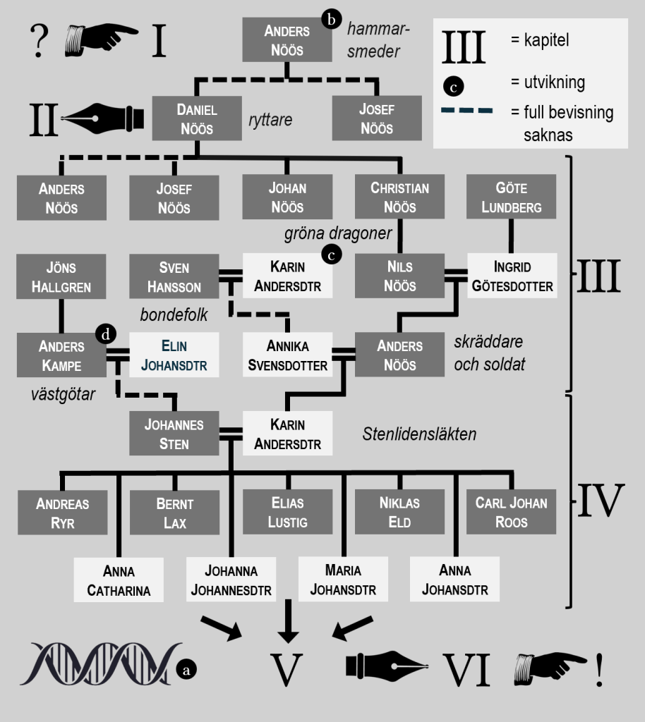 Innehållsförteckning. Detta släktträd omfattar till stor del samma personer som föregående. Det kompletterar innehållsförteckningen i en kommande släktbok genom att visa i vilka kapitel olika karaktärer förekommer. Initiala frågor (?) ställs i Inledningskapitlet I och förhoppningsvis mynnar den avslutande reflektionen i kapitel VI ut i någon form av svar (!). Mer perifera anor behandlas i bilagorna a-d, här kallade utvikningar. Släktträdet är ritat i PowerPoint.